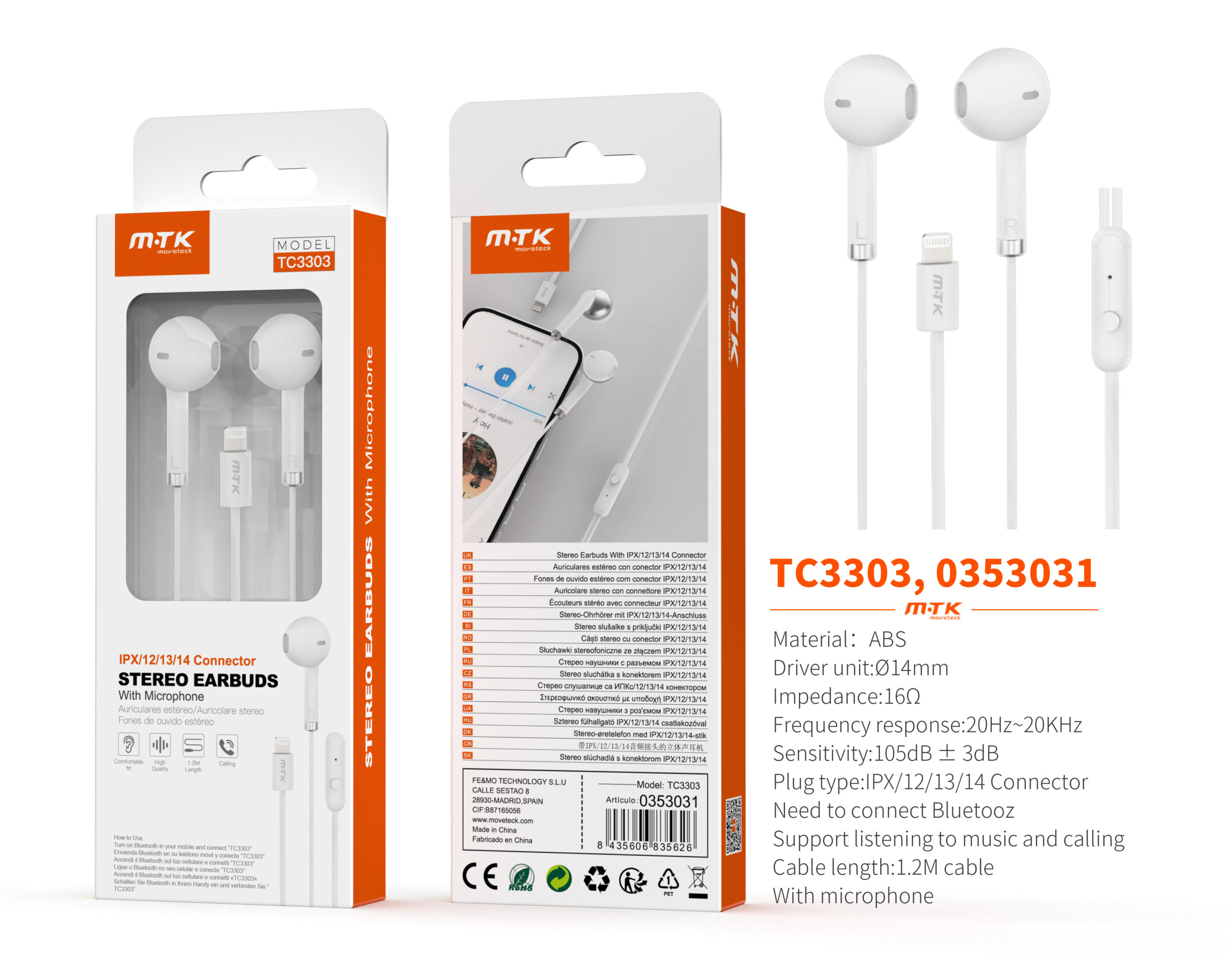 TC3303 BL Auricular Lightning Meldan con microfono , (Necesario Bluetooth)Cable 1.2m, Blanco