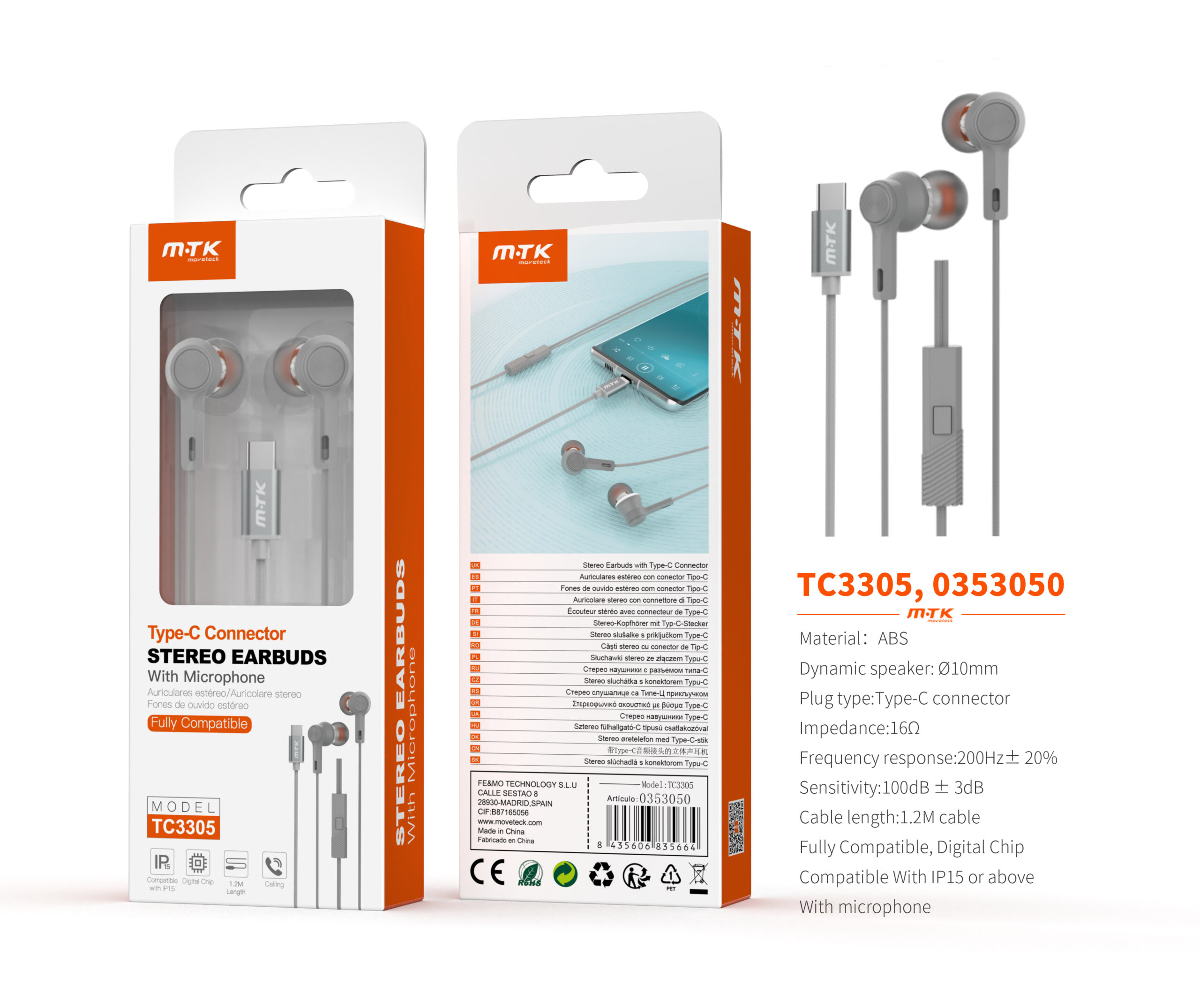TC3305 GR Auricular Type-C Galros con microfono y boton de llamada full compatible, Cable 1.2m, Gris