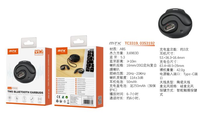 TC3319 NE Auriculares TWS Bluetooth 5.3 Smart Touch, Bateria 50mAh con estuche recargable 250mAh, Negro