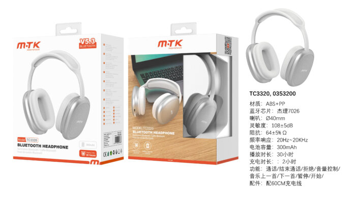 TC3320 Luxury BL+GR Auricular Bluetooth 5.3, 30 hora reproduccion, Soporta llamadas, Bateria 300mAh, Blanco+Gris