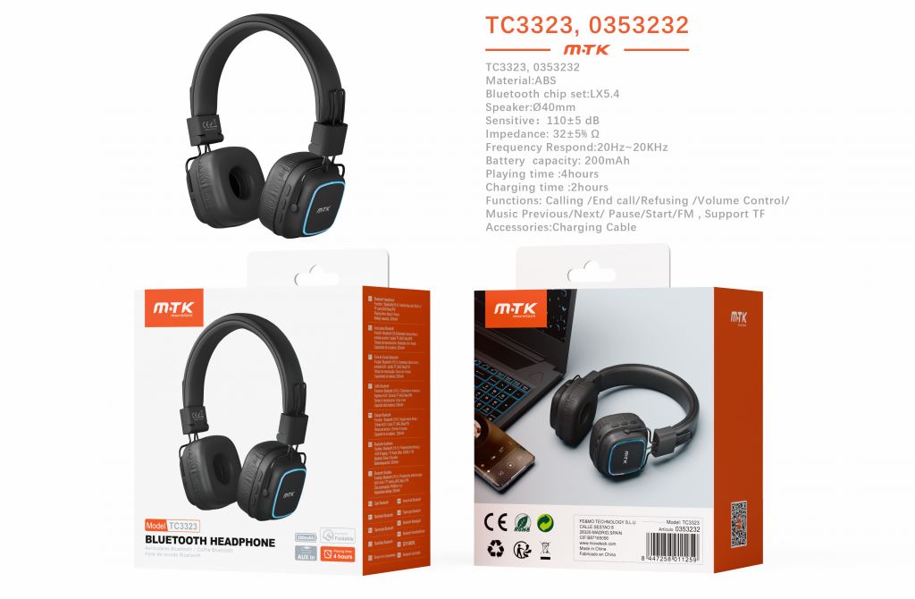 TC3323 NE Auriculares Casco plegable Bluetooth 5.4 con luz LED, Soporta llamadas/Tarjeta TF/Entrada AUX 3.5mm, Bateria 200mAh, Negro
