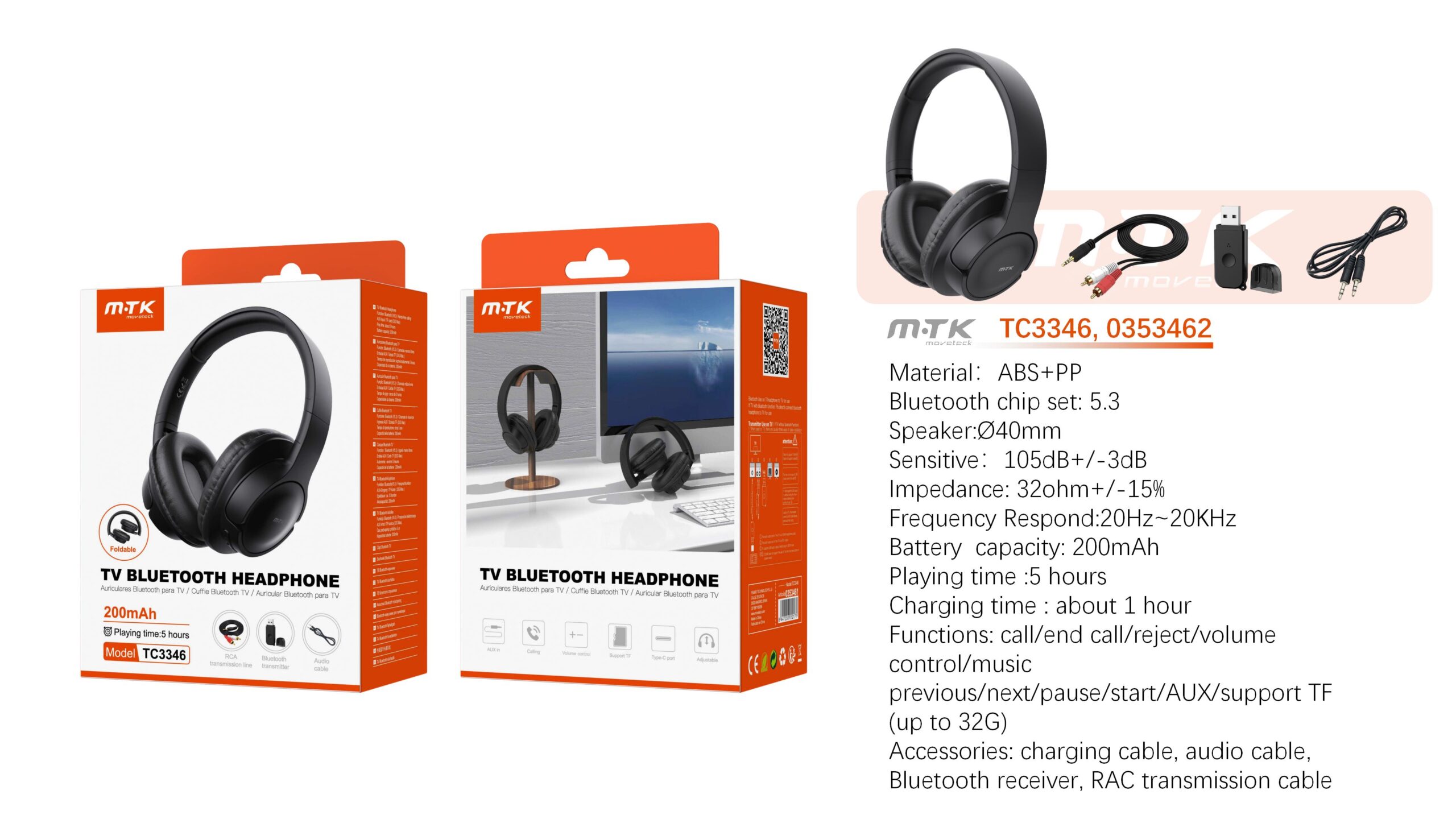 TC3346 NE Auricular TV Bluetooth 5.3 plegable, Soporte llamadas/Entrada Aux 3.5mm/Tarjeta TF/RAC, Bateria 200mAh, Negro
