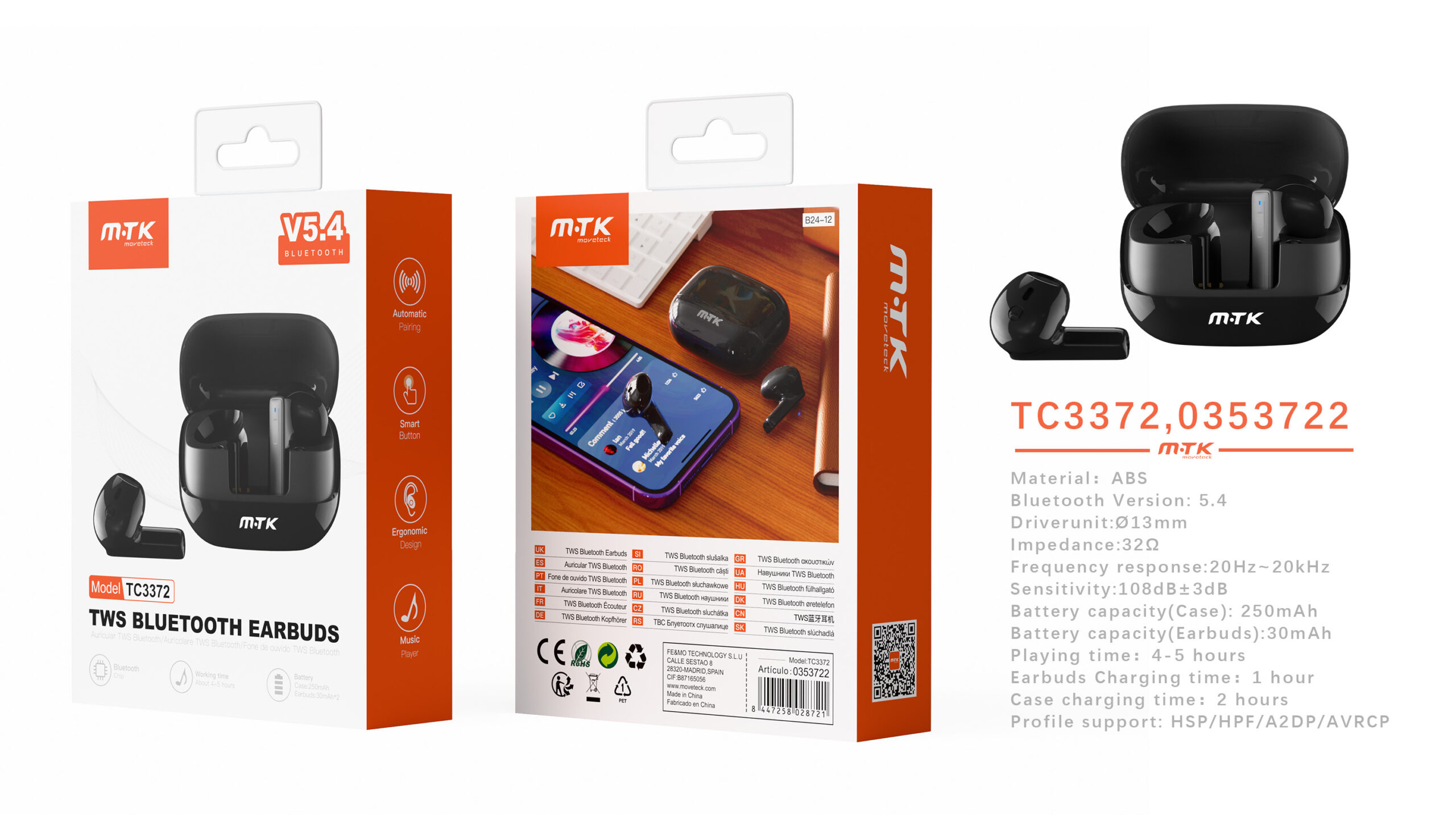 TC3372 NE Auriculares TWS Bluetooth 5.4 , Bateria (30mAh*2)Con Estuche Recargable 250mAh, Negro