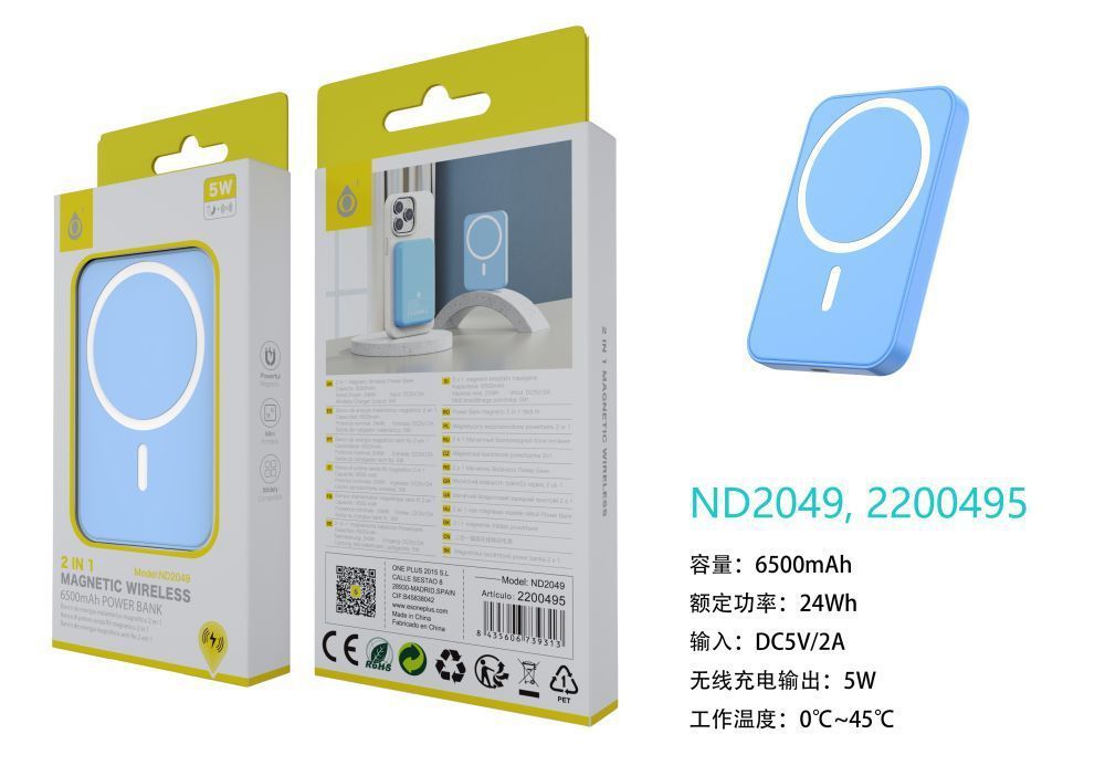 ND2049 AZ PowerBank Magneticos 6500mAh/24Wh, Con Carga Inalambrica 5W, Entrada Lightning, Azul