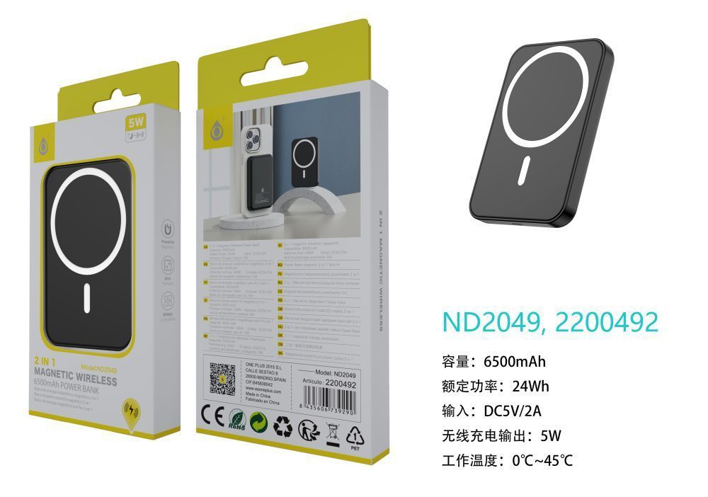 ND2049 NE PowerBank Magneticos 6500mAh/24Wh, Con Carga Inalambrica 5W, Entrada Lightning, Negro
