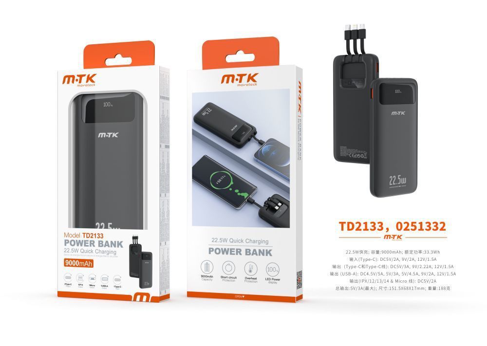 TD2133 NE Luxury PowerBank 9000mAh/33.3Wh, Carga Rapida 22.5w, 1entrada(Type-C), 5salida(2*Type-C+lightning++Micro+USB-A), Negro