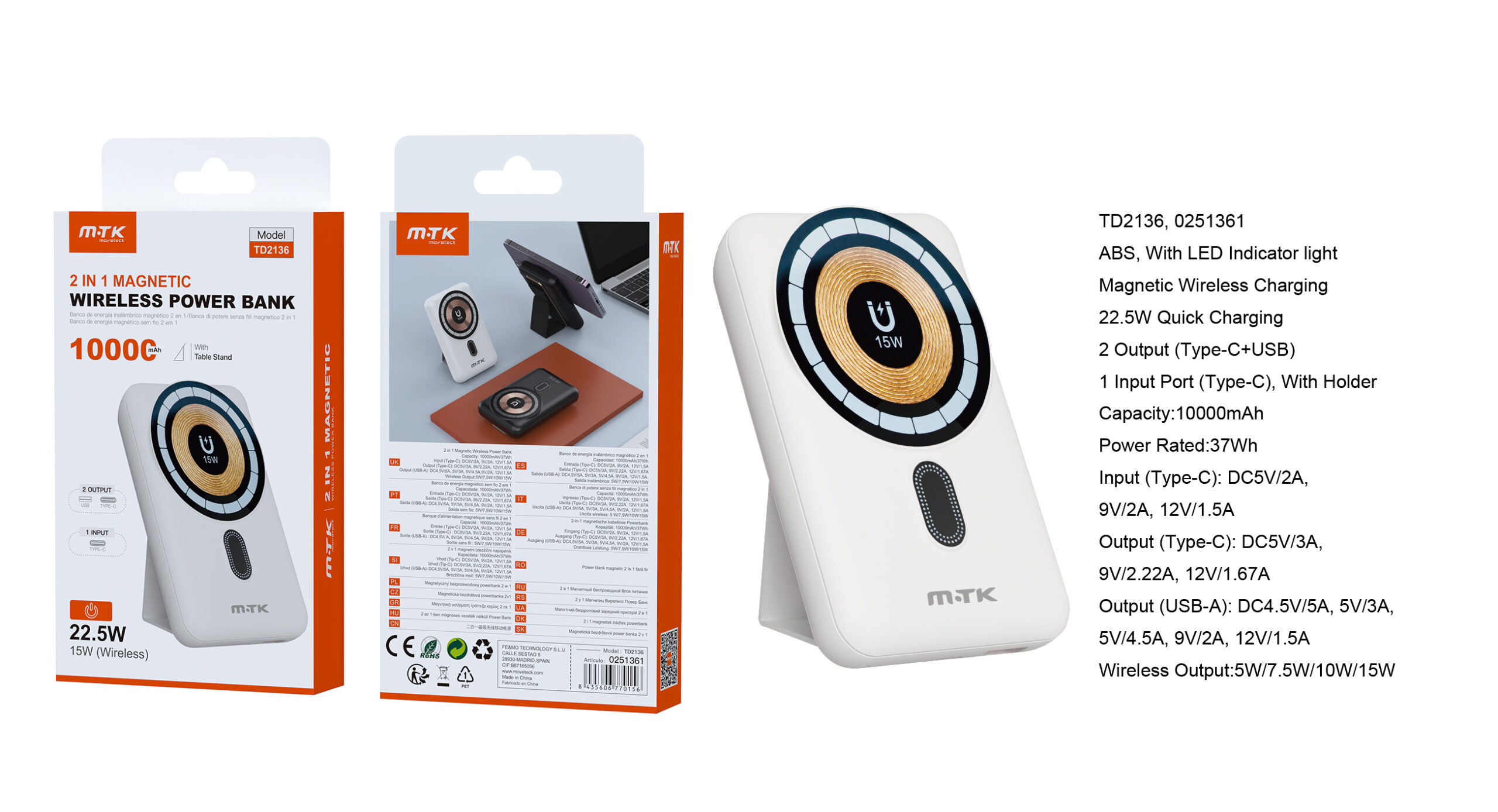 TD2136 BL Powerbank con carga inalambrica 15W, Carga Rapida 22.5W 10000mAh/37Wh, Blanco