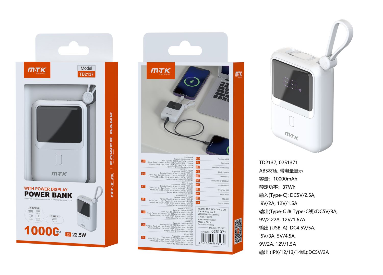TD2137 BL PowerBank 10000mAh/37Wh con carga rapida 22.5W, 1 Entrada USB-C y 4 Salida USB-A/USB-C/Cable Type-C/Cable lightning, Blanco