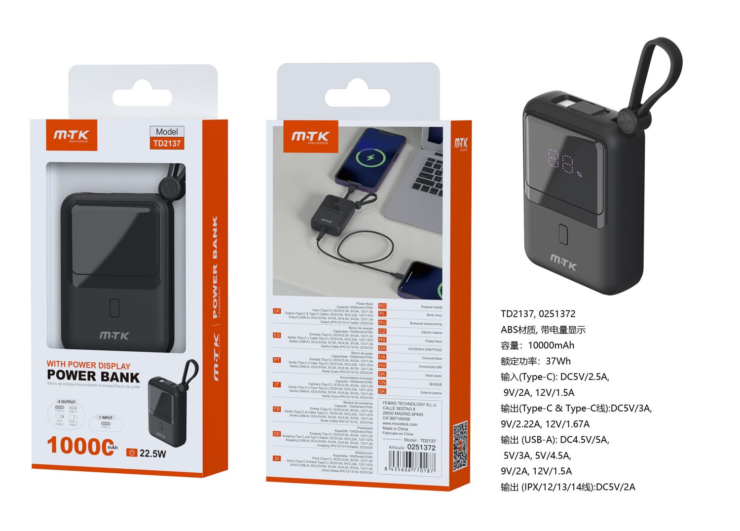 TD2137 NE PowerBank 10000mAh/37Wh con carga rapida 22.5W, 1 Entrada USB-C y 4 Salida USB-A/USB-C/Cable Type-C/Cable lightning, Negro