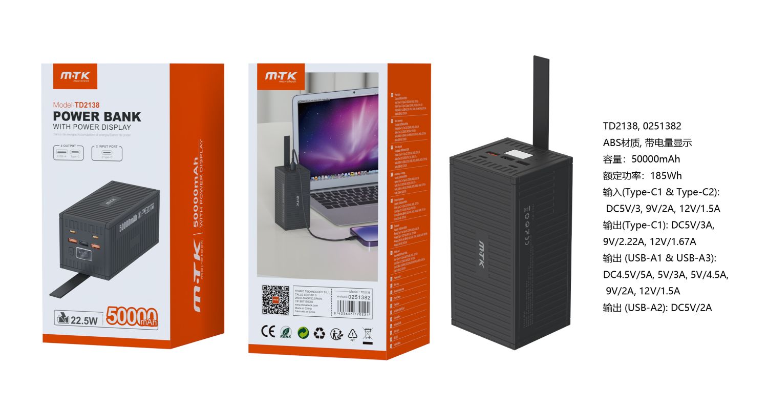 TD2138 NE PowerBank 50000mAh/185Wh con carga rapida 22.5W, 2 Entrada USB-C y 4 Salida USB-A*3/USB-C*1, Negro