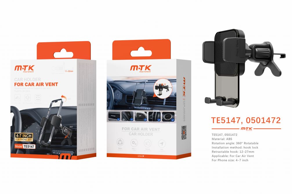 TE5147 NE Luxury Soporte universal airvent de coche, 360° rotacion, Retractil 11-27mm, para movil 4-7 pulgadas, Negro