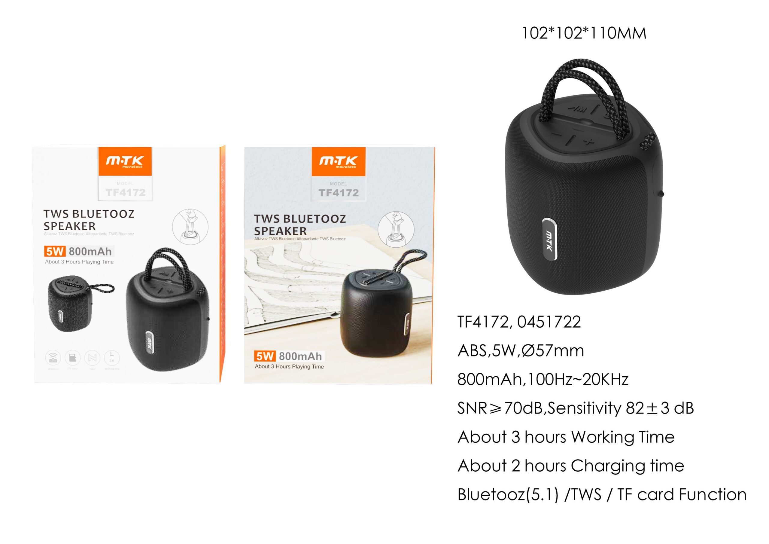 TF4172 NE Altavoz TWS Blutooth 5.1 Portatil, SoportaTWS/Blutooth/TF,  Bateria 800mAh/5W, Negro