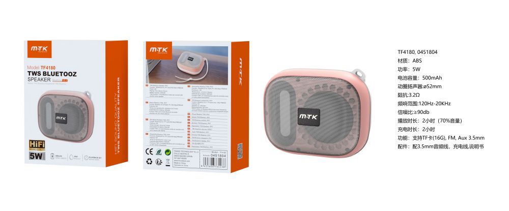 TF4180 RS Altavoz TWS HIFI con Bluetooth 5.3, IPX7, Soporta FM/Aux 3.5/TF(16G Max), 5W, Bateria 500mAh, Rosa