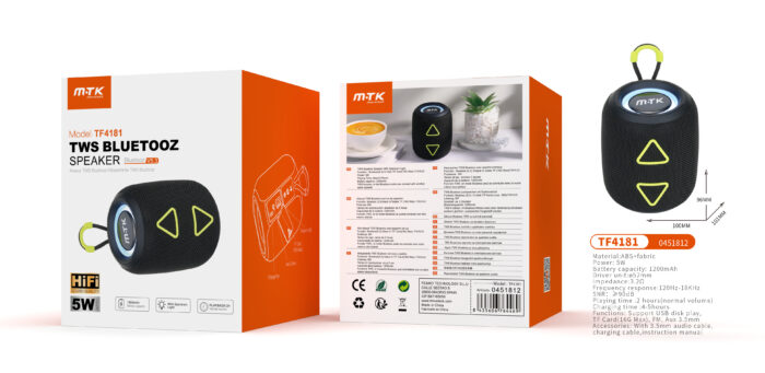 TF4181 NE Altavoz TWS HIFI con Bluetooth 5.3, Luz espectro, Soporta USB/FM/TF(16G Max)/Aux 3.5mm, 5W, Bateria 1200mAh, Negro