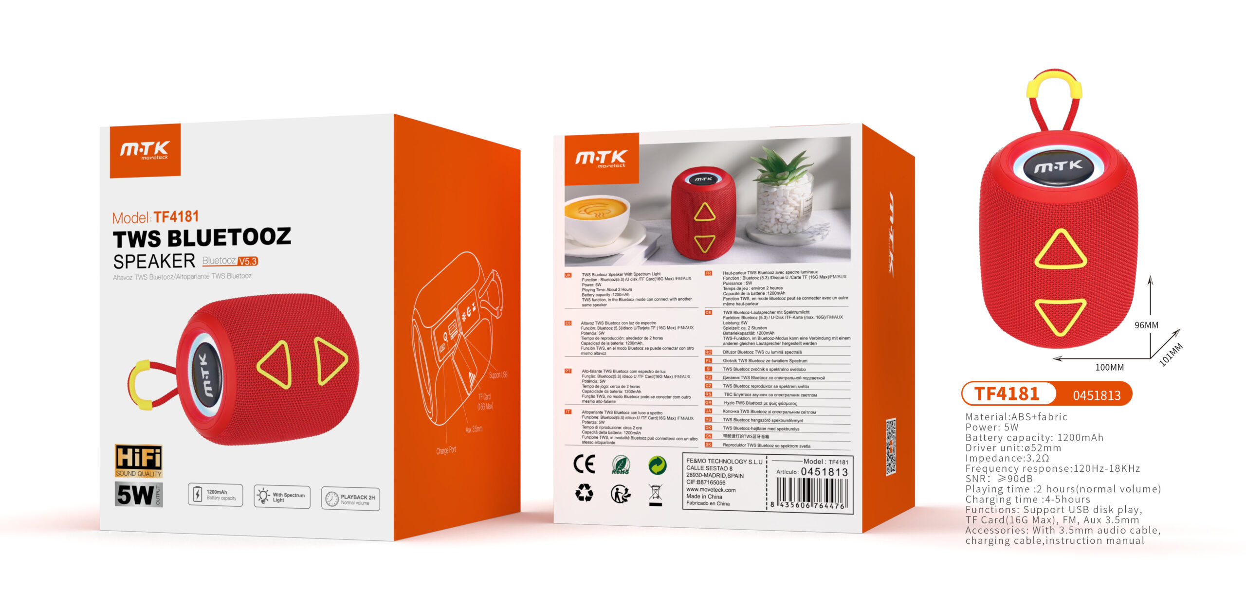 TF4181 RJ Altavoz TWS HIFI con Bluetooth 5.3, Luz espectro, Soporta USB/FM/TF(16G Max)/Aux 3.5mm, 5W, Bateria 1200mAh, Rojo