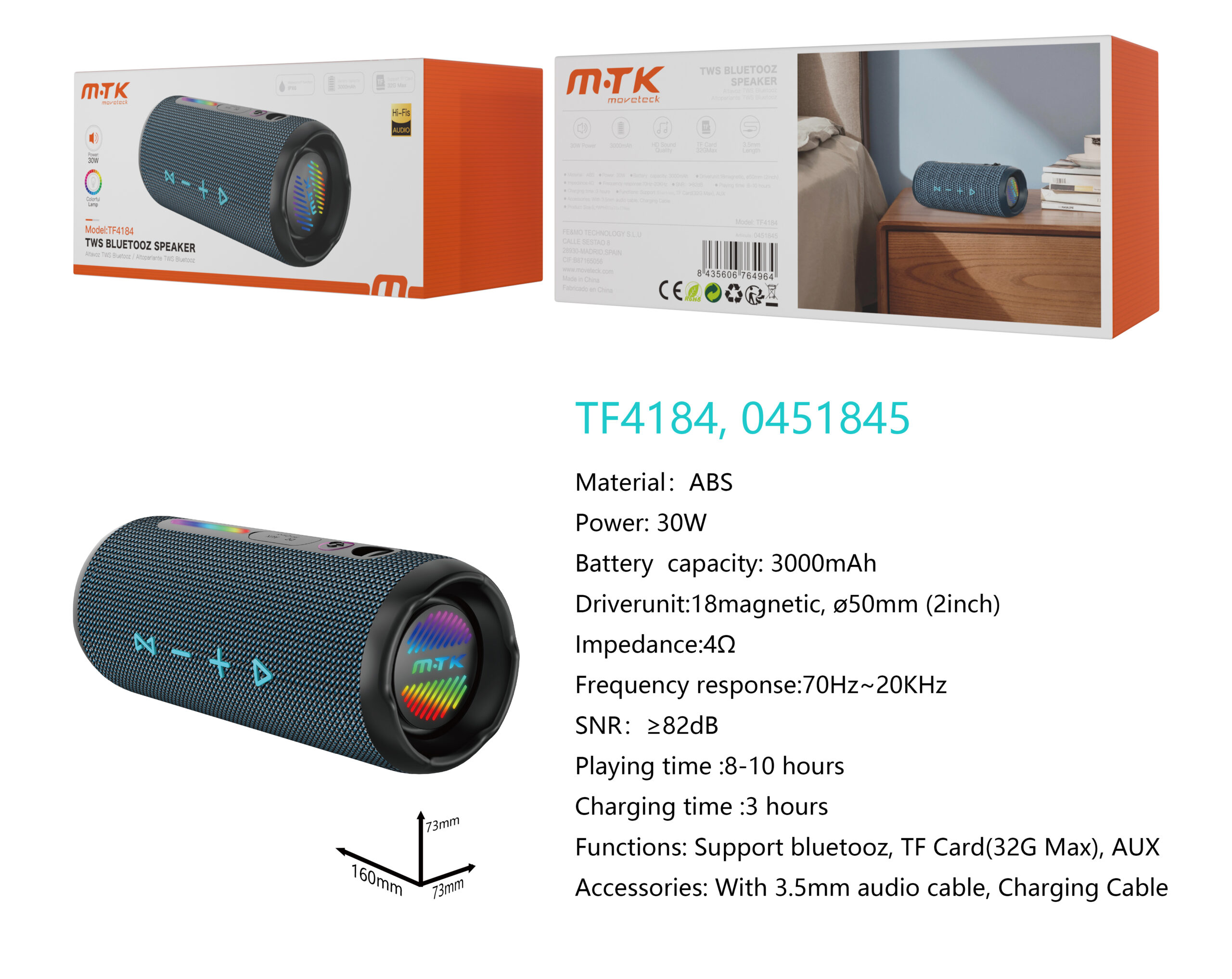 TF4184 AZ Altavoz TWS HIFI con Bluetooth, Luz RGB , Soporta AUX/TF(32G Max), 30W, Bateria 3000mAh, Azul