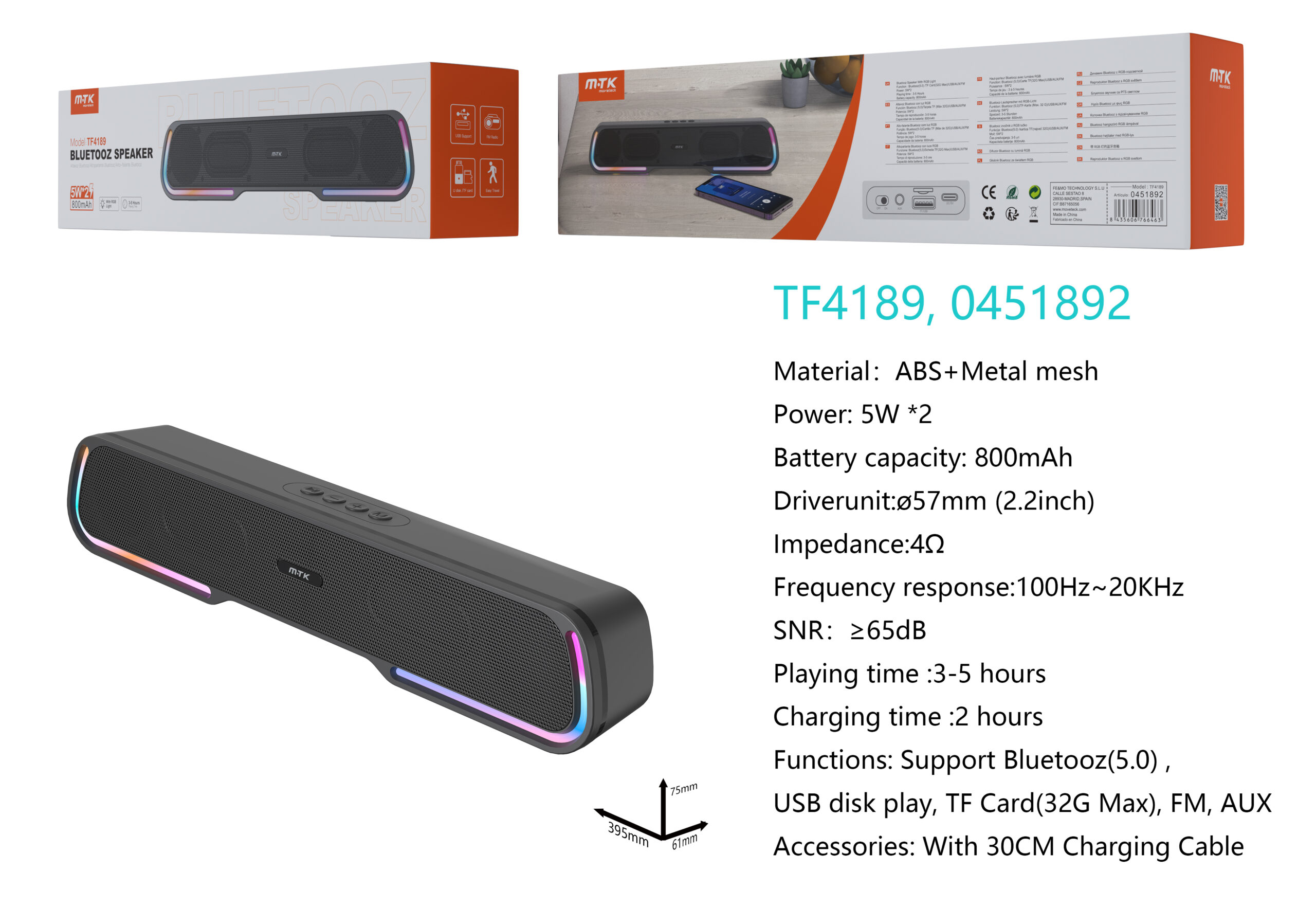 TF4189 NE Altavoz Bluetooth 5.0 Con Luz LED RGB, Soporta Entrada de USB/FM/AUX/TF(Max 32G), Bateria 800mAh/5W*2, Negro