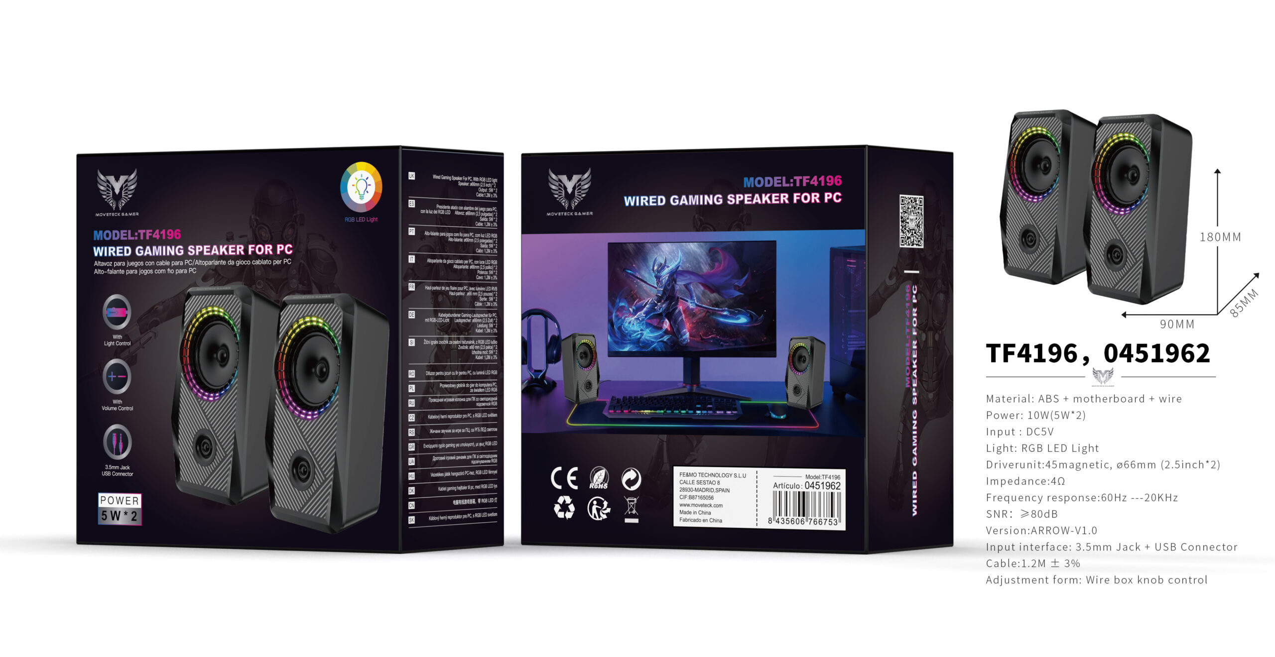 TF4196 NE Altavoz Gaming Con Luz LED RGB, Cable 1.5M/jack 3.5mm+USB, 5W*2, Negro
