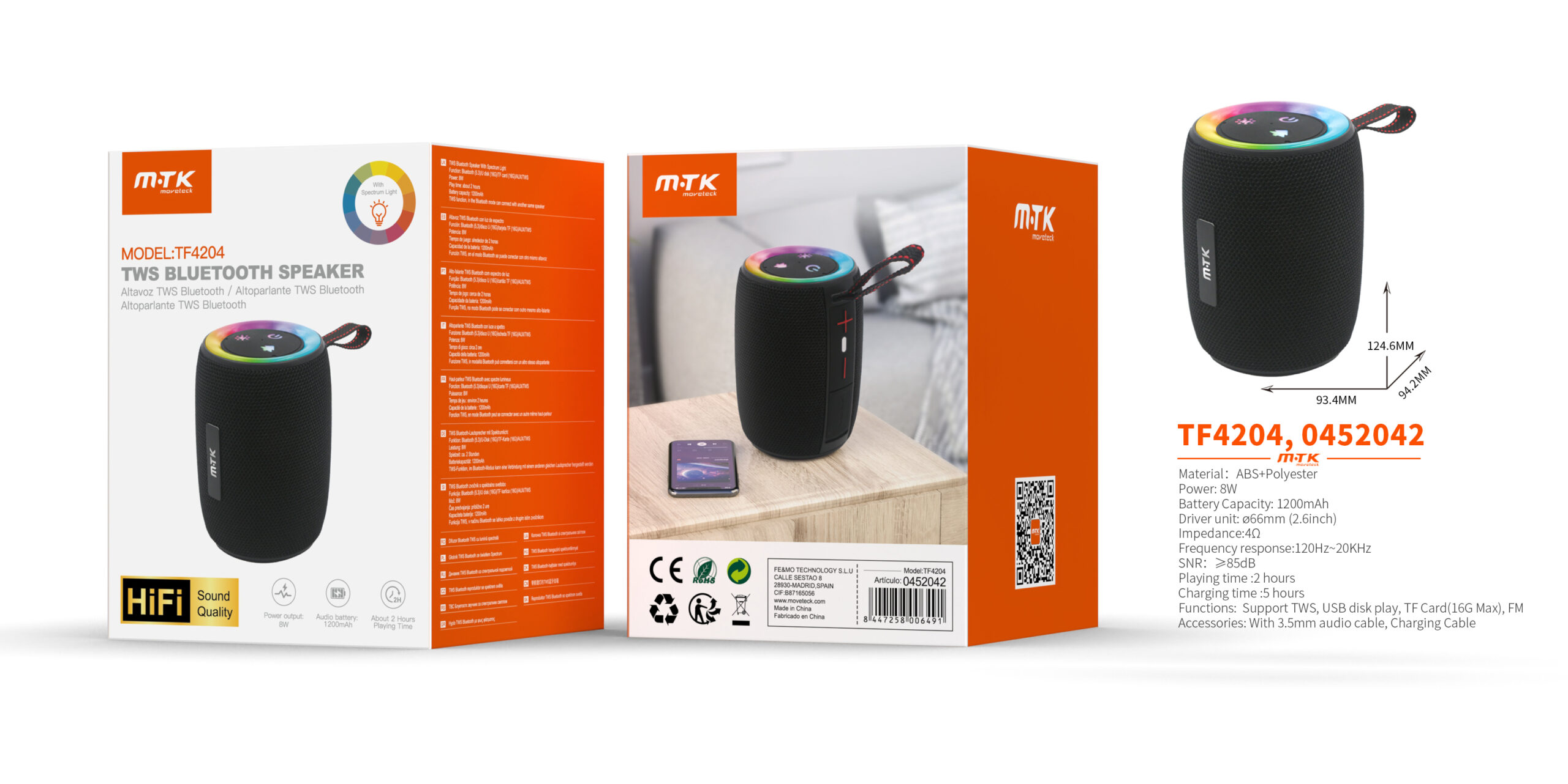 TF4204 NEAltavoz HIFI TWS Bluetooth 5.3, Con Luz espectro,Soporta TF/USB/FM/AUX, Bateria 1200mAh/8W, Negro