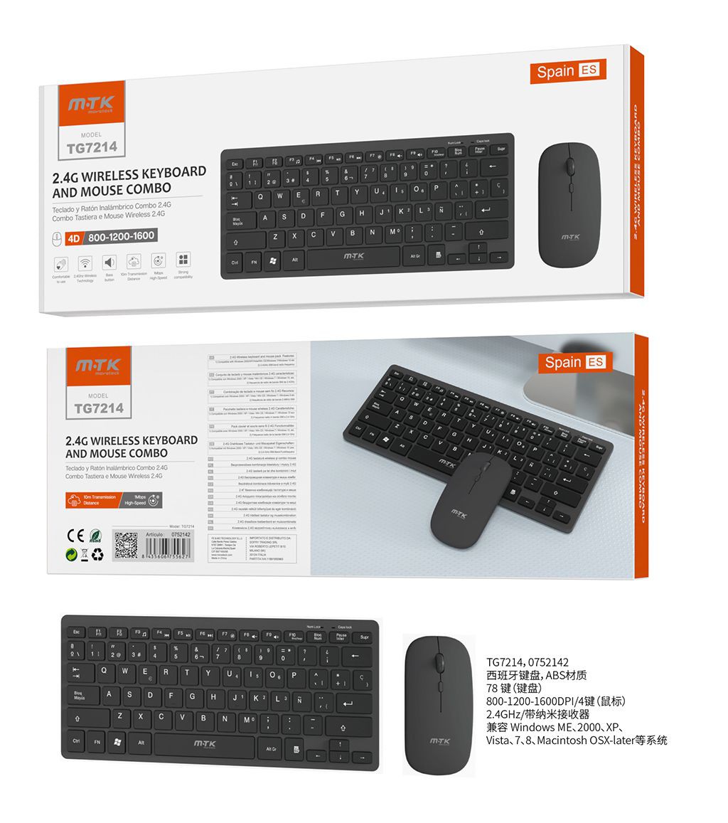 TG7214 NE Conjunto de Teclado y Raton Inalambrico , 78 Teclados en Espanol, con Raton 4D de 800-1600