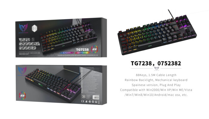 • NE TG7207 Teclado Gaming Con Cable 1,5M y Luz RGB, 104 teclados con Placa Hierro, Compatible Con Win2000/Win XP/Win ME/Vista/Win 7/8/Android/Linux /IO