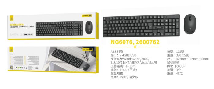• NG6079 NE Combo de teclado 105 key Espanol y raton 3D 1000DPI, Con cable 1.5m, Negro