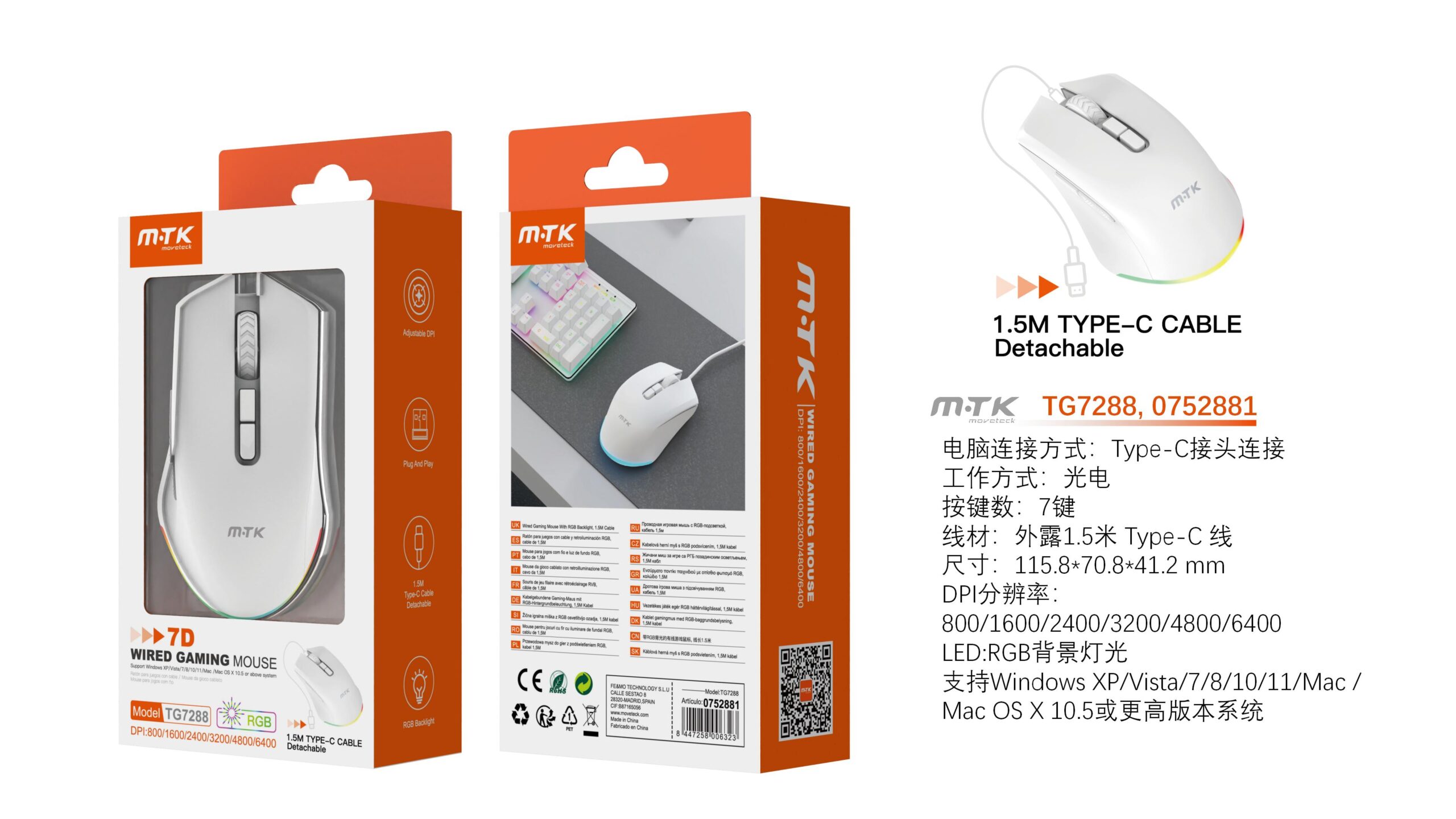 TG7288 BL Raton Gaming RGB optico 7D DPI de 800 hasta 6400, Cable 1.5M,Blanco