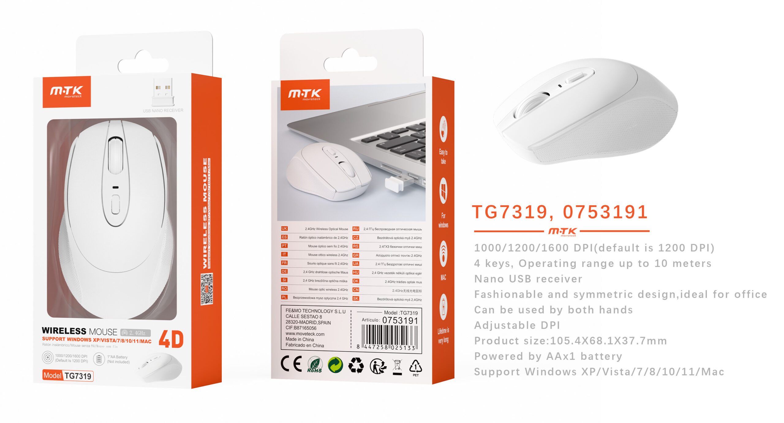 TG7319 BL Raton Inalambrico ambidiestro 4D/1000-1200-1600DPI, Bateria AA*1 No incluido, Blanco