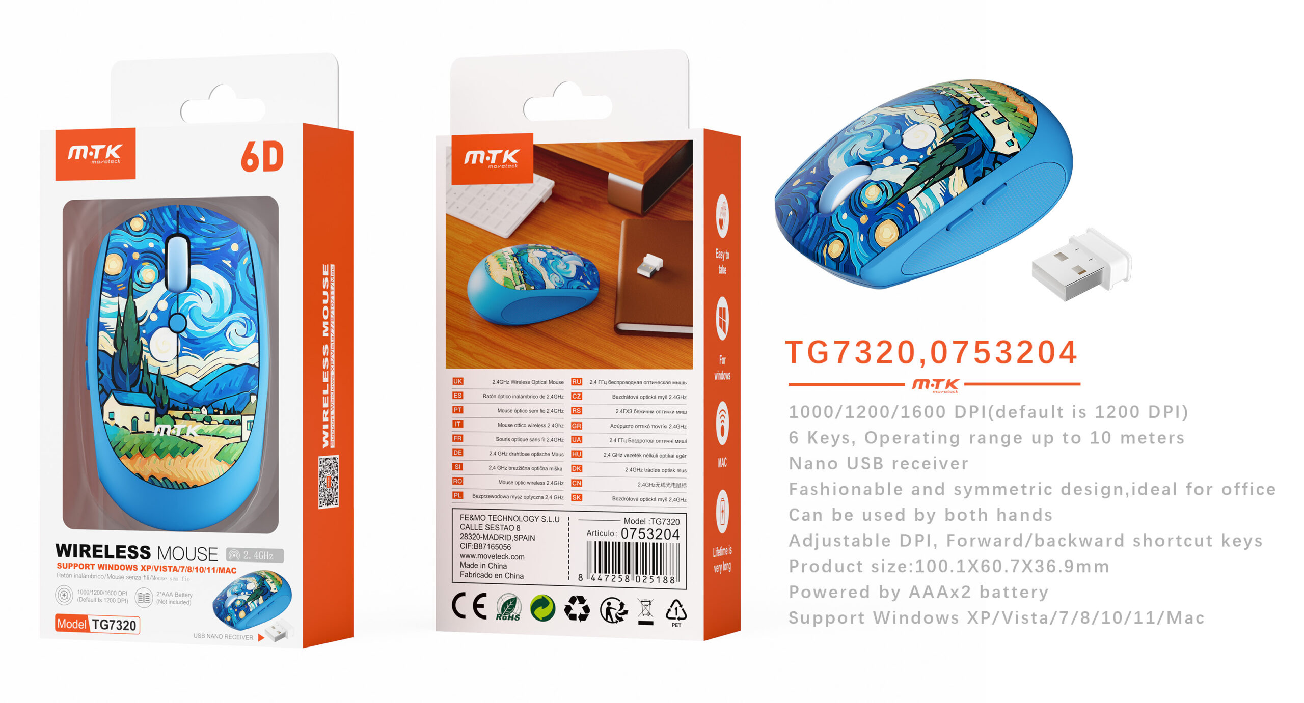 TG7320 Raton Inalambrico ambidiestro con diseño artistico 6D/1000-1200-1600DPI, Bateria AAA*2 No incluido