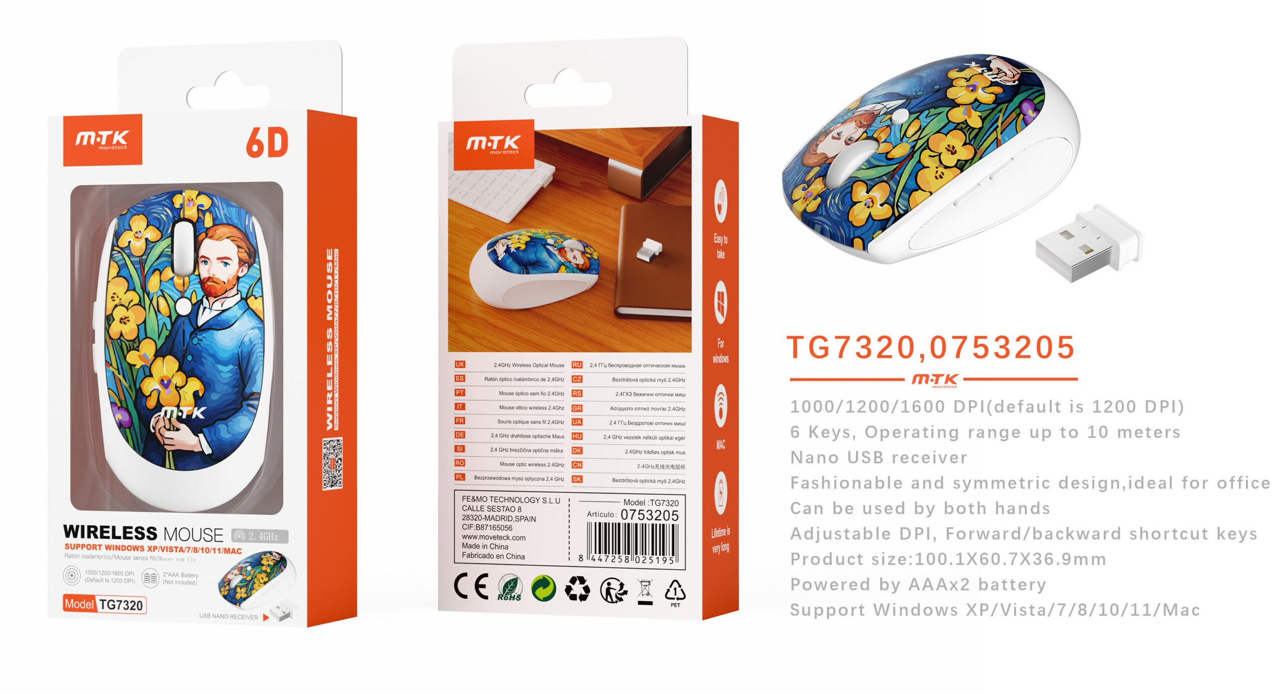 TG7320 Raton Inalambrico ambidiestro con diseño artistico 6D/1000-1200-1600DPI, Bateria AAA*2 No incluido