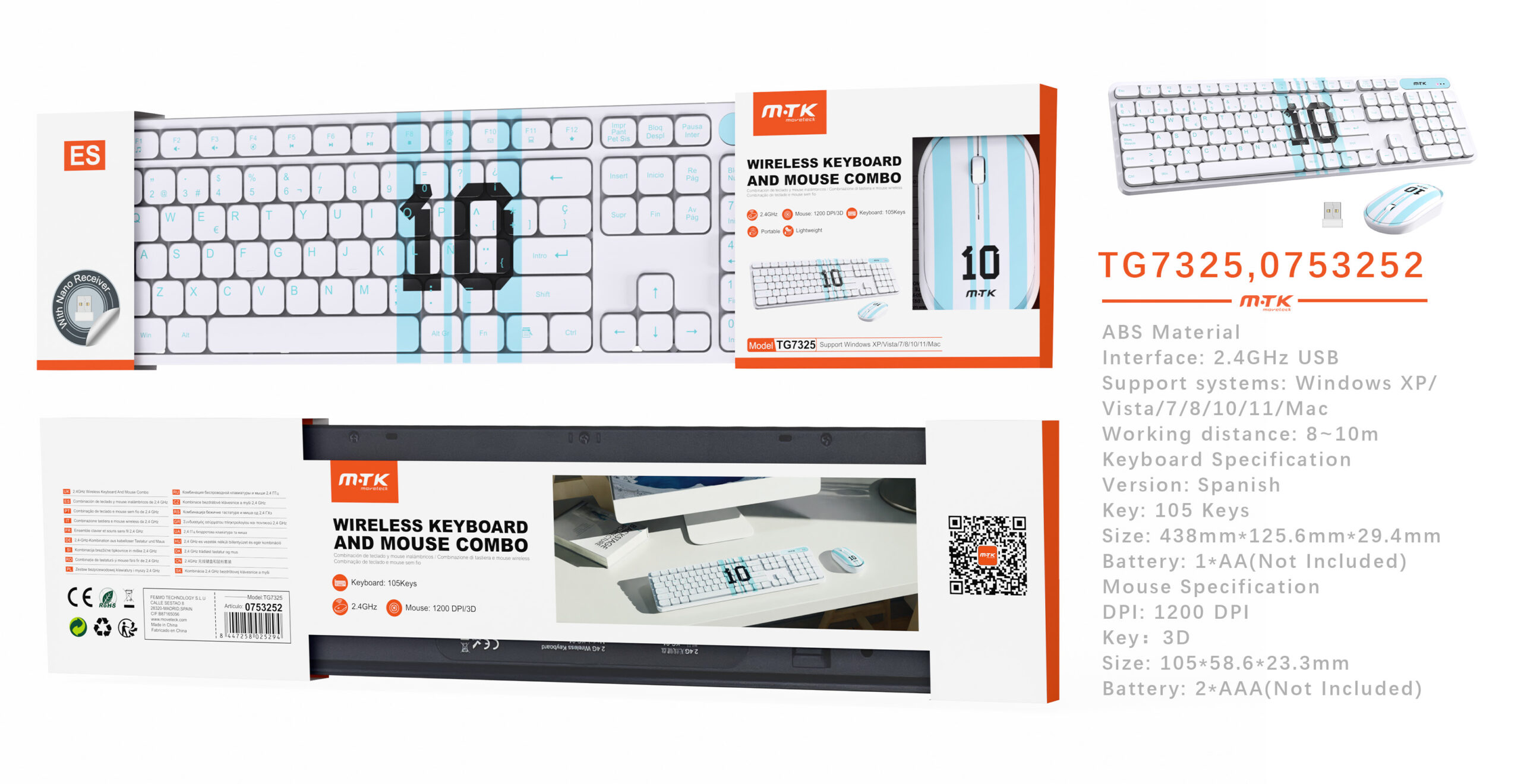 TG7325 BL Combo de teclado Espanol con diseno futbolistico Argentina , 105 keys y raton 3D 1200 DPI, Nano USB, Blanco