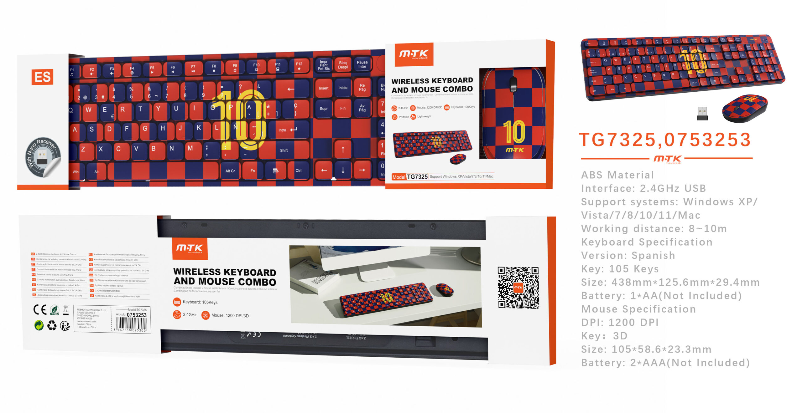 TG7325 BL Combo de teclado Espanol con diseno futbolistico Barcelona, 105 keys y raton 3D 1200 DPI, Nano USB, Blanco