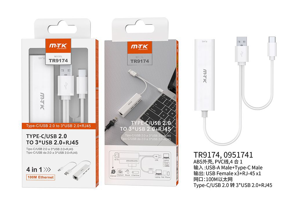 TR9174 BL Cable de Adaptador  Type-C/USB 2.0  Con HUB x3 + Entrada Red RJ45, Blanco