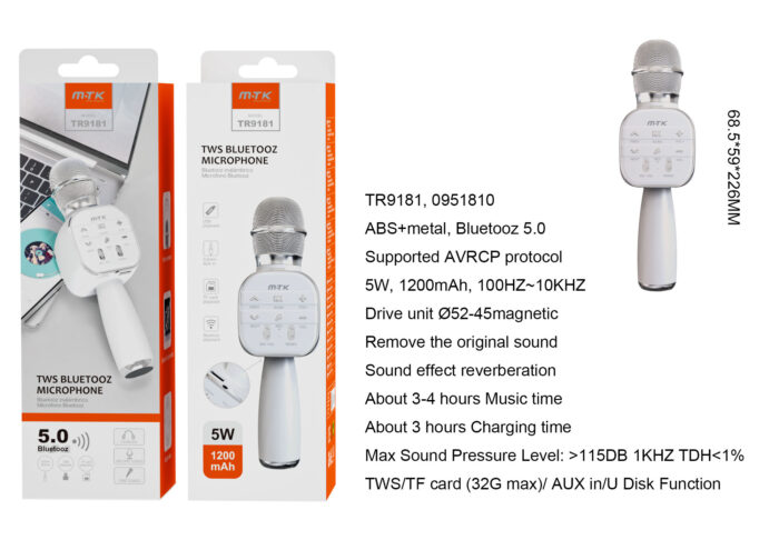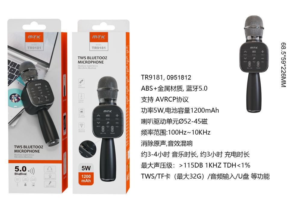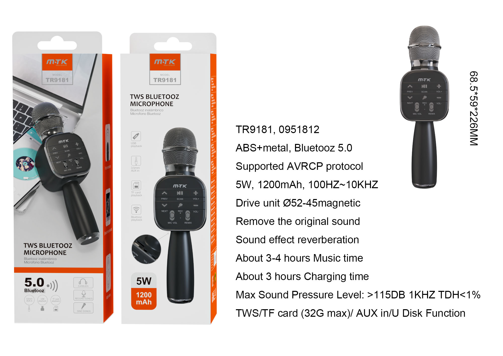 TR9181 NE Microfono TWS Bluetooth 5.0 AVRCP, Frecuncia100Hz-10KHz, Soporta Entrada de audio/USB/TF (32GMax), Bateria 1200mAh/5W, Negro