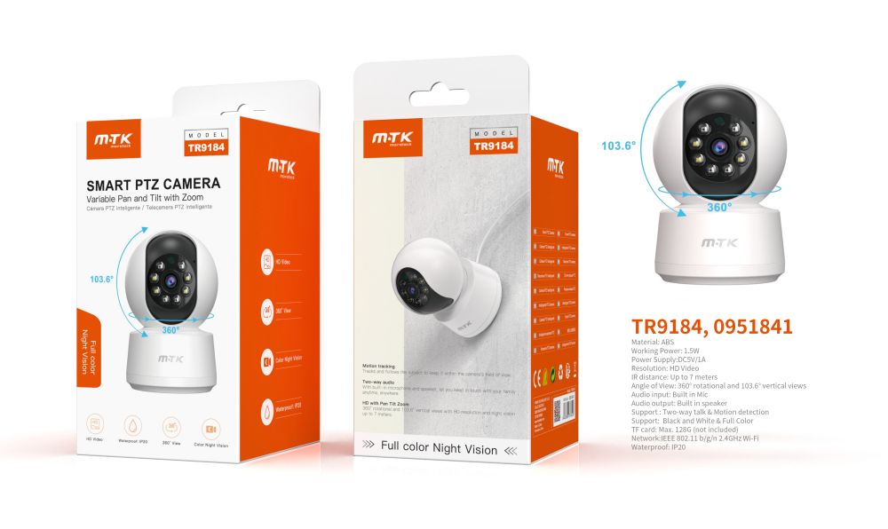 TR9184 Camara Vigilancia PTZ ,Movimiento 360°/ 103.6°, Deteccion de movimiento, Seguimiento Automatico, Full color en Vision nocturna, Audio bidireccional, IP20/720P, Blanco