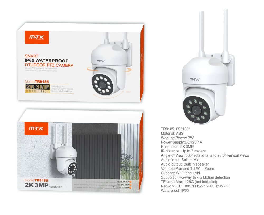 TR9185 Camara Vigilancia PTZ ,Movimiento 360/ 93.6°, Deteccion de movimiento, Seguimiento Automatico, Audio bidireccional, Vision nocturna con infrarrojos, IP65/2k, Blanco