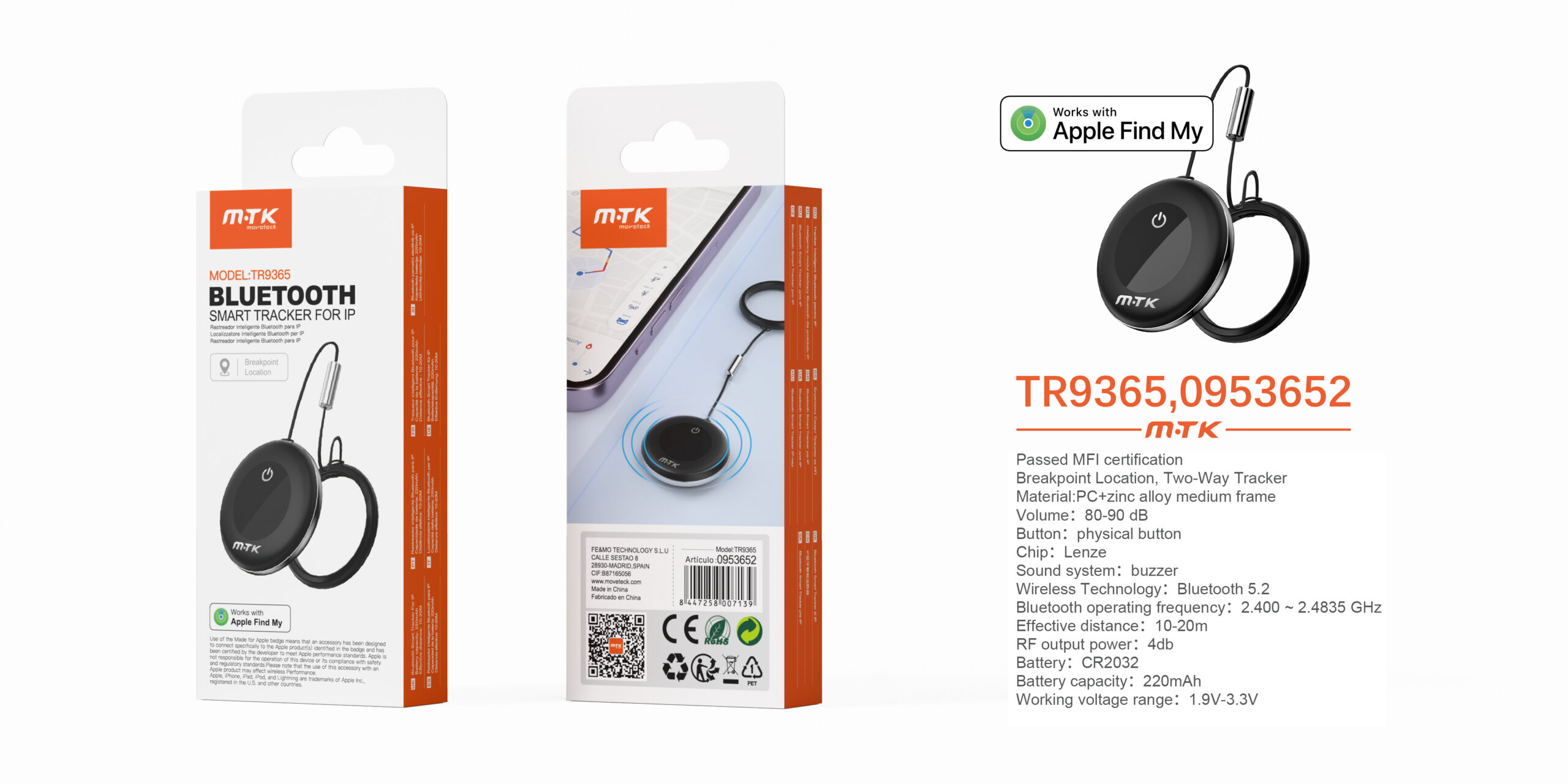 TR9365 NE Localizador de Bluetooth 5.2 , APPLE MFI Compatible con Apple Find My, Bateria CR2032, Negro