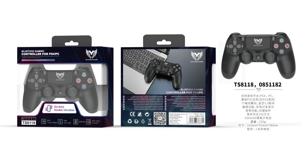 TS8118 NE Mando de control Gaming Con Bluetooth 5.0 para PS4/PC, Con Doble Vibracion, Bateria 600mAh, Negro