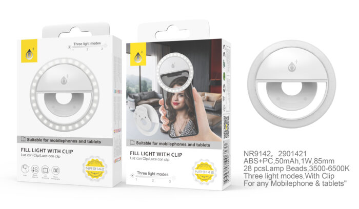 • NR9142 NE Mini Anillo Luz LED con Clip Universal para Moviles, 3 Niveles de Brillo, Negro