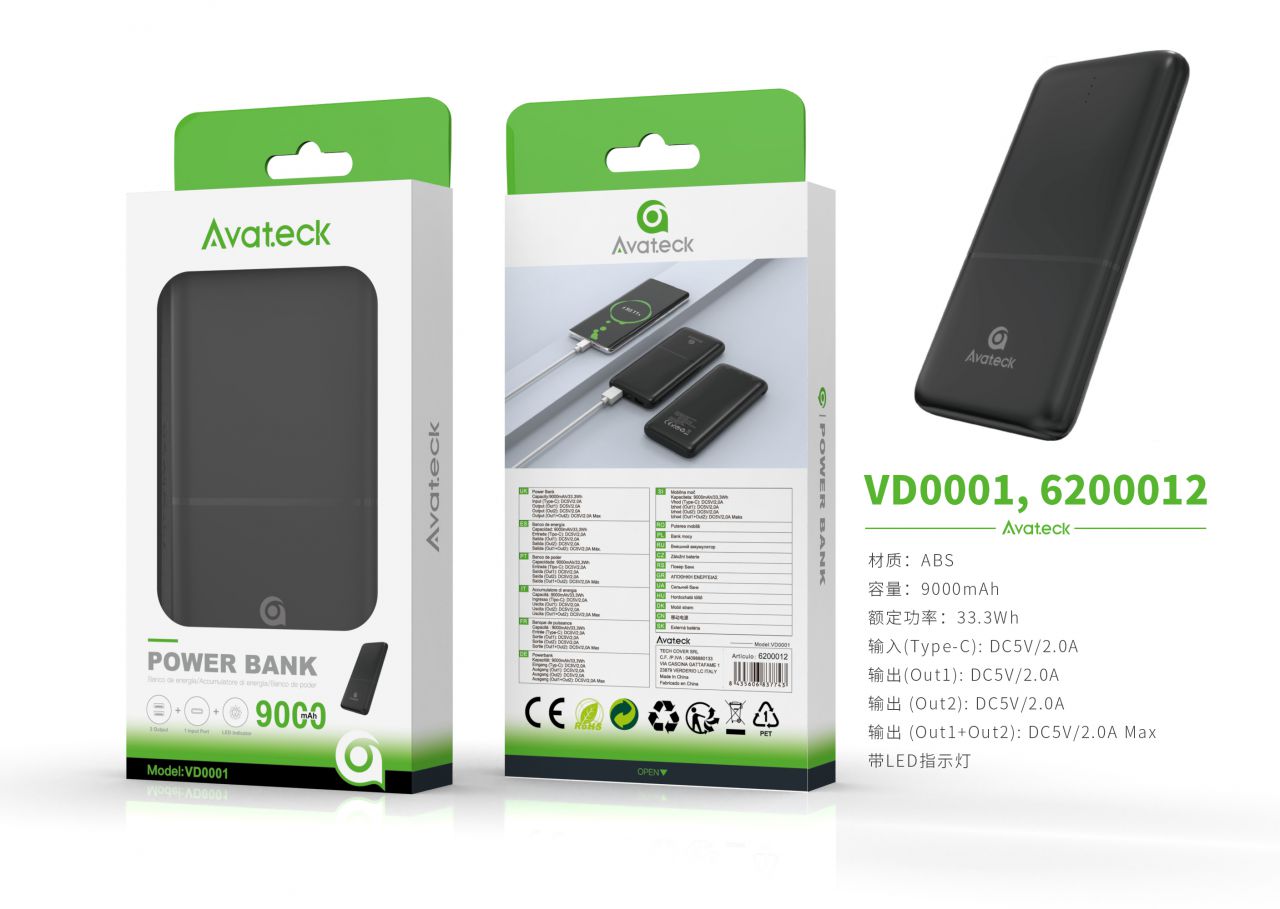 VD0001 NE PowerBank Isla con indicador bateria 9000mAh/33.3Wh, 1 entradaType-C+2 salida USB, Negro