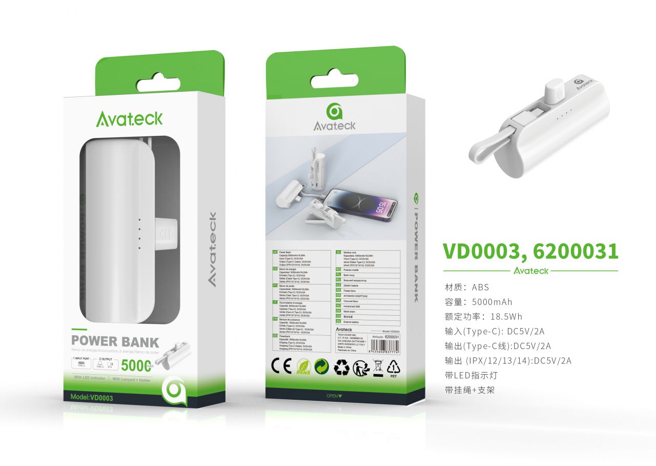VD0003 BL Powerbank  con indicador bateria 5000mAh/18.5Wh, 1 Entrada Type-C  y 2 salida Cable Type-C+Lightning), Blanco