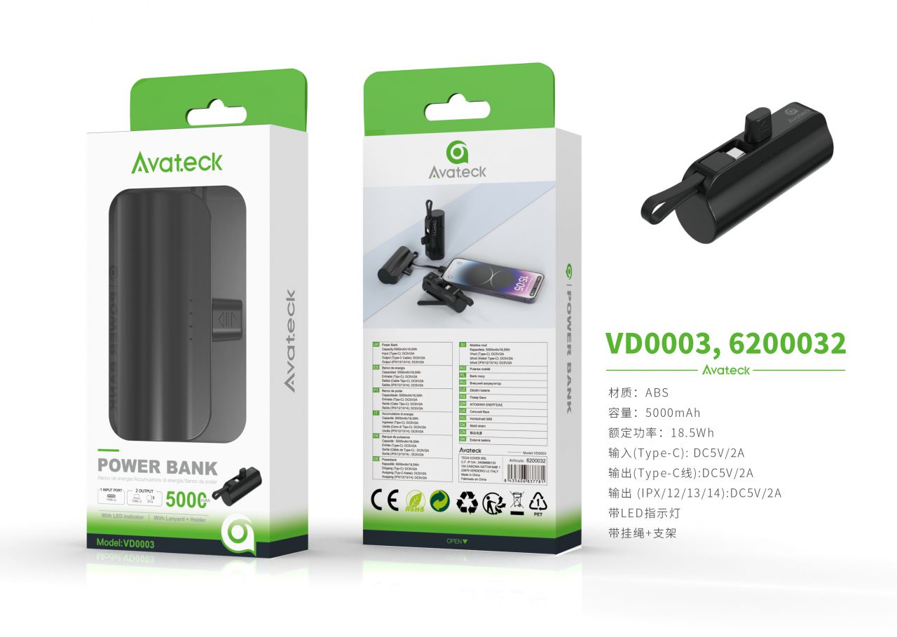 VD0003 NE Powerbank  con indicador bateria 5000mAh/18.5Wh, 1 Entrada Type-C  y 2 salida Cable Type-C+Lightning, Negro