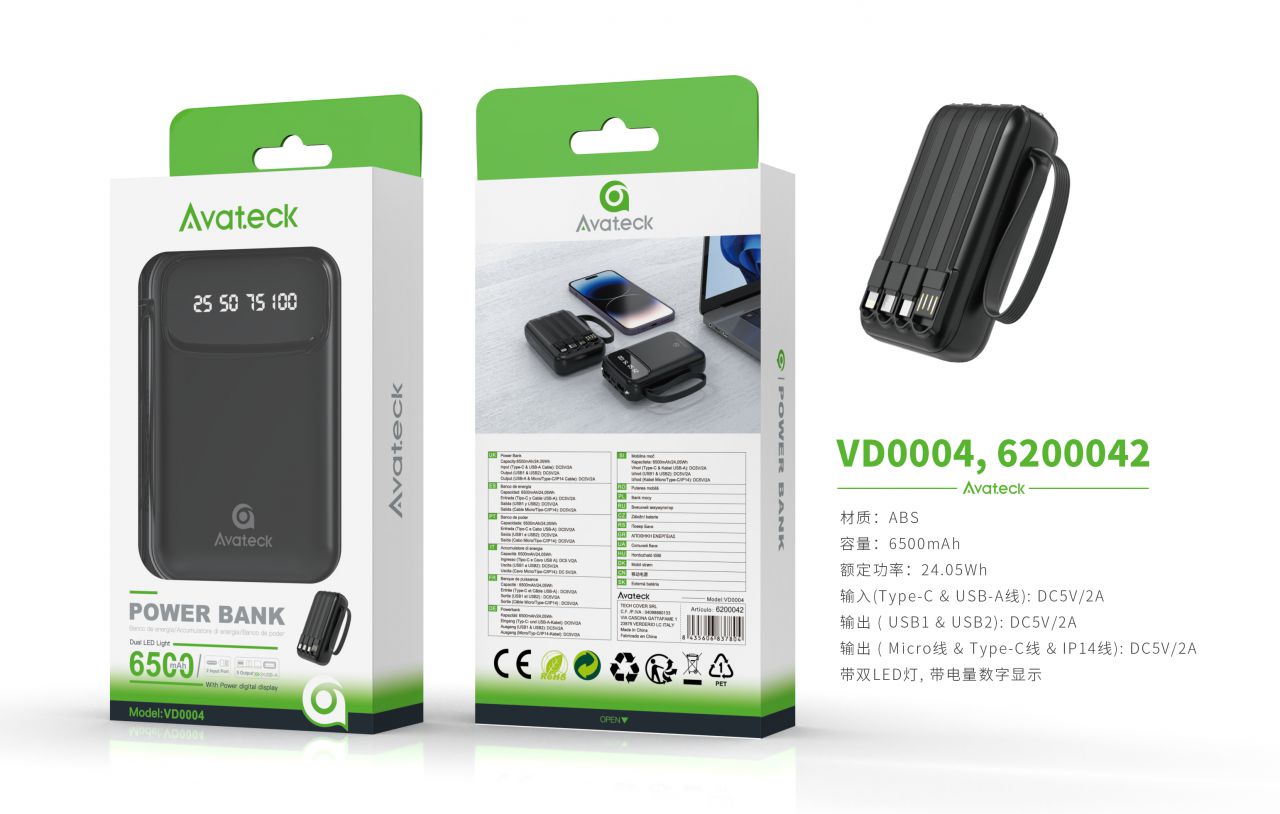 VD0004 NE Powerbank  6500mAh/24.05Wh con dual linterna y indicador de bateria, 2 entrada Type-C+ USB  y 4 de salida Micro USB+Lightning+Type-C+USB 2.0, Negro