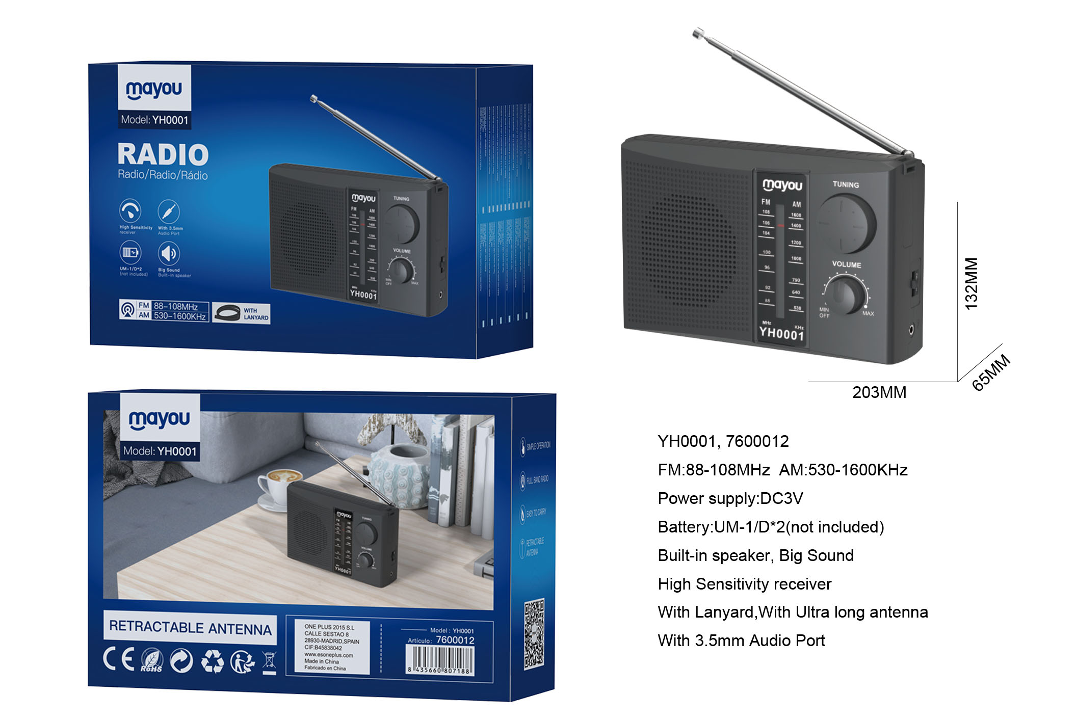 • YH0005 Radio portatil conantena y pantalla LED, Con funcion de despertador, Bateria 2*AAA (No incluido)
