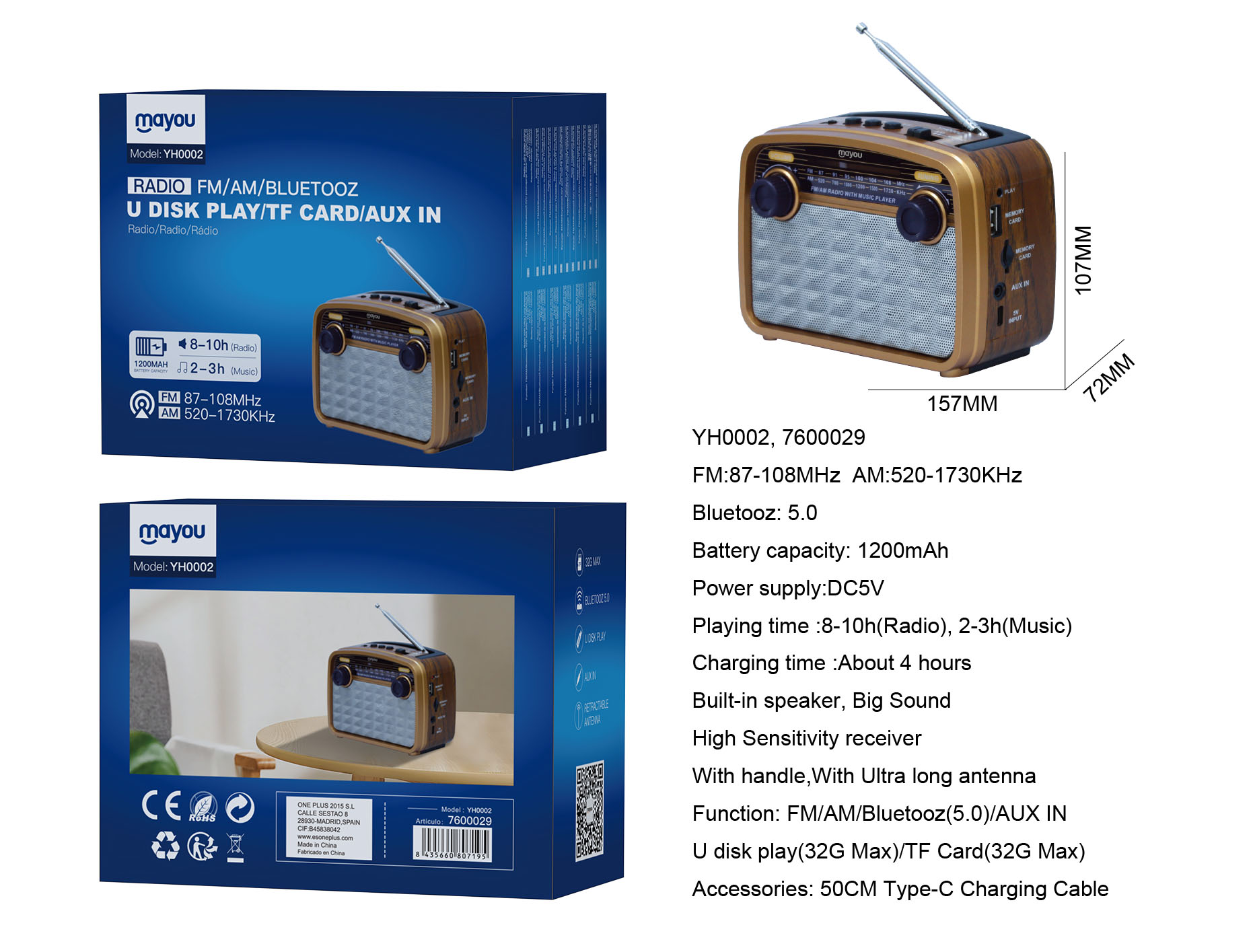 YH0002 Radio Bluetooth 5.0 portatil con antena y mandos, Soporta USB/TF 32G (Max), Bateria 1200mAh