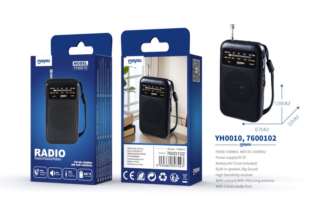 YH0010 NE Radio portatil AM/FM con Antena y correa , Entrada de jack 3.5mm, Bateria 2*AA (No incluida), Negro