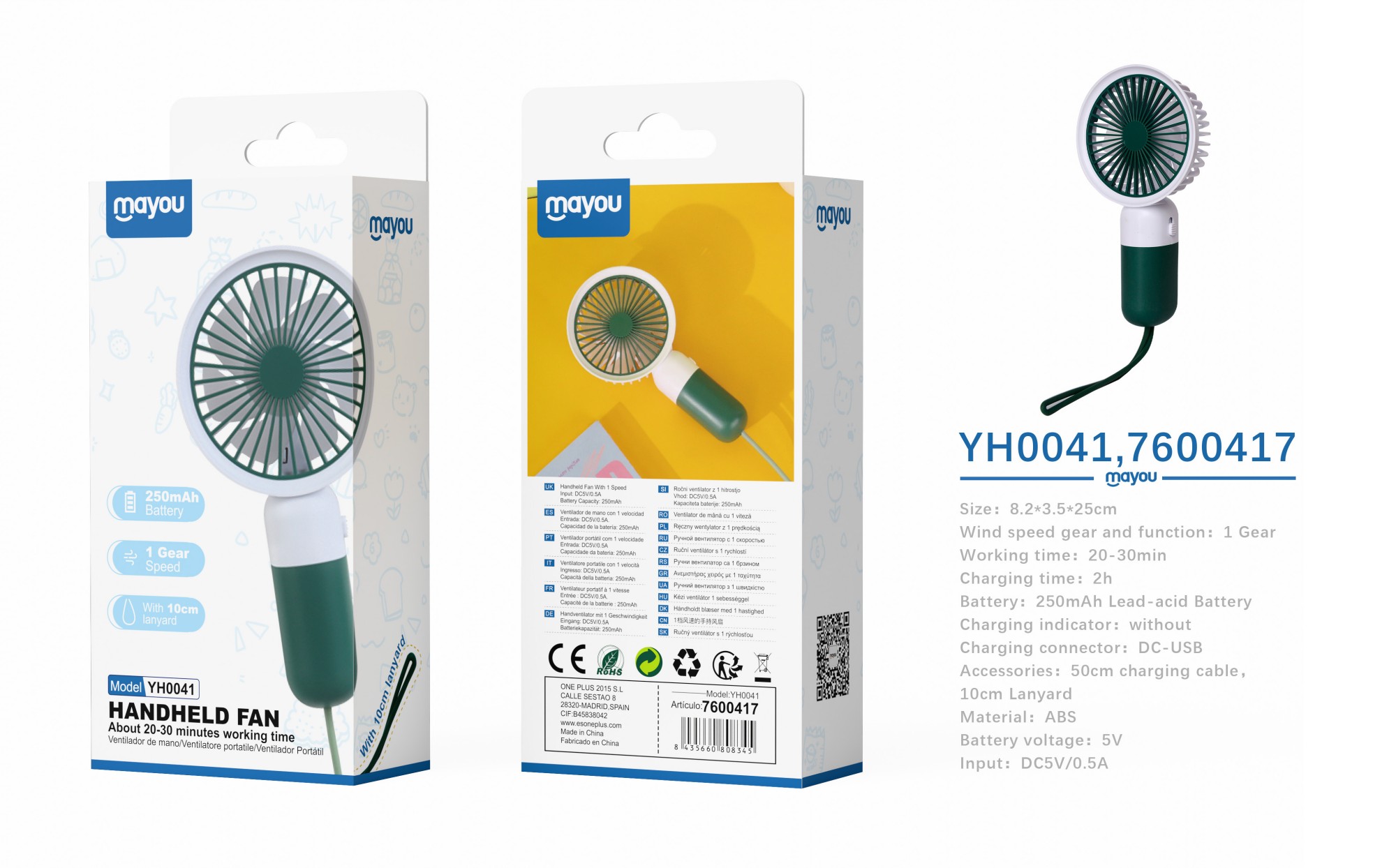 YH0041 VE Mini Ventilador de mano con correa, 1 Velocidad, baterias recargable 250mAh, Verde