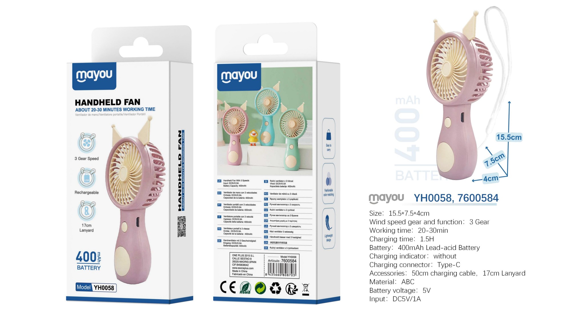 YH0058 RS Mini Ventilador de mano, 3 Velocidades, baterias recargable 400mAh, Rosa
