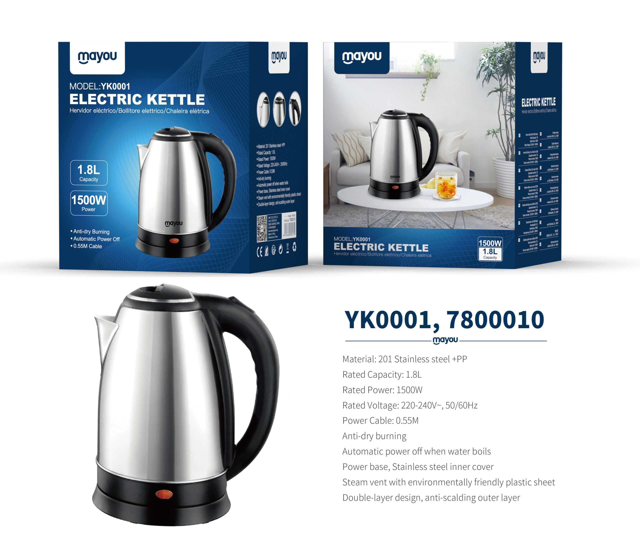 YK0001 Hervidor de agua electrico 1.8 Litros, Acero Inoxidable 201, Con doble capa, 1500w, Cable 0.55m