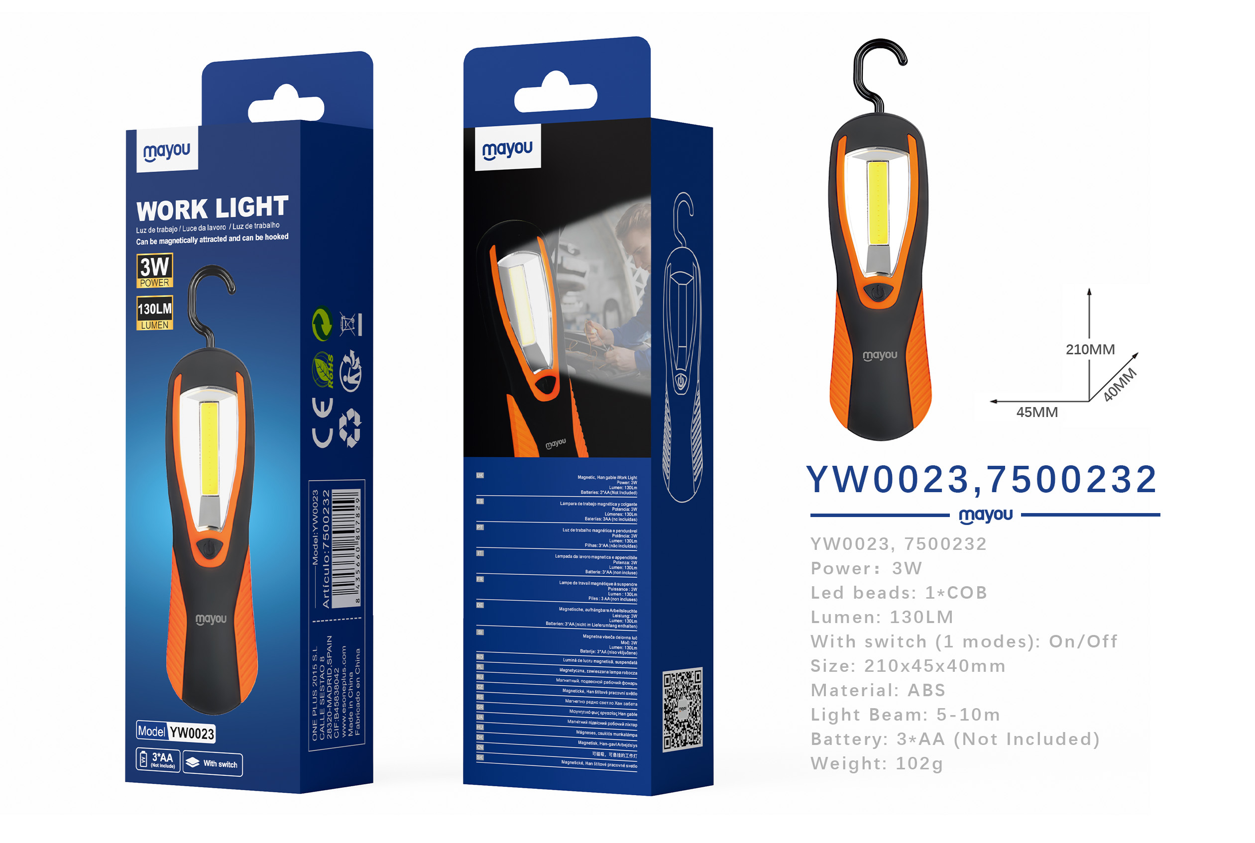 YW0023 NA+NE Linterna COB de trabajo con gancho colgante,3W/130LM, Bateria AA*3 No incluido,Naranja+negro